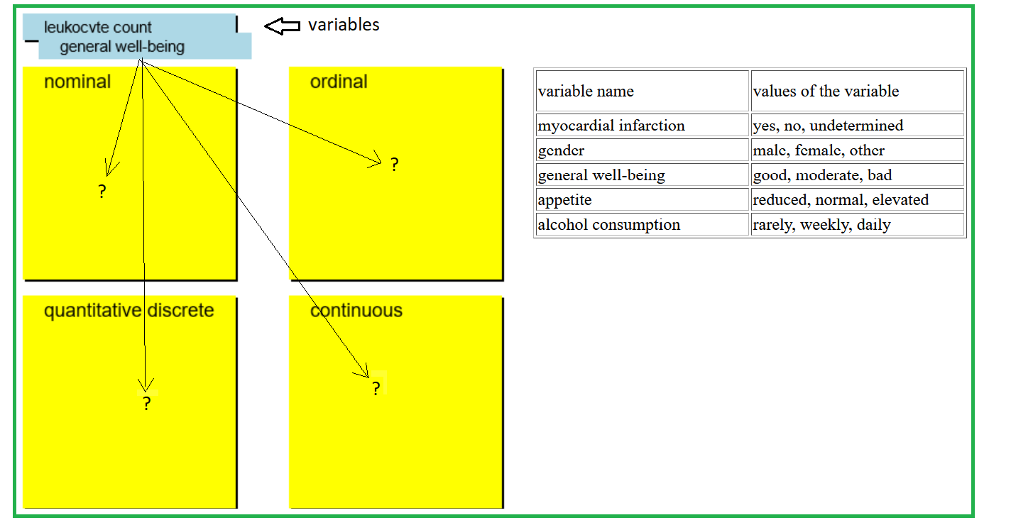 | nominal (qualitative) | Values of nominal variables define categories without a natural order | ordinal (qualitative) | Yalues of ordinal variables define categories with a natural order |