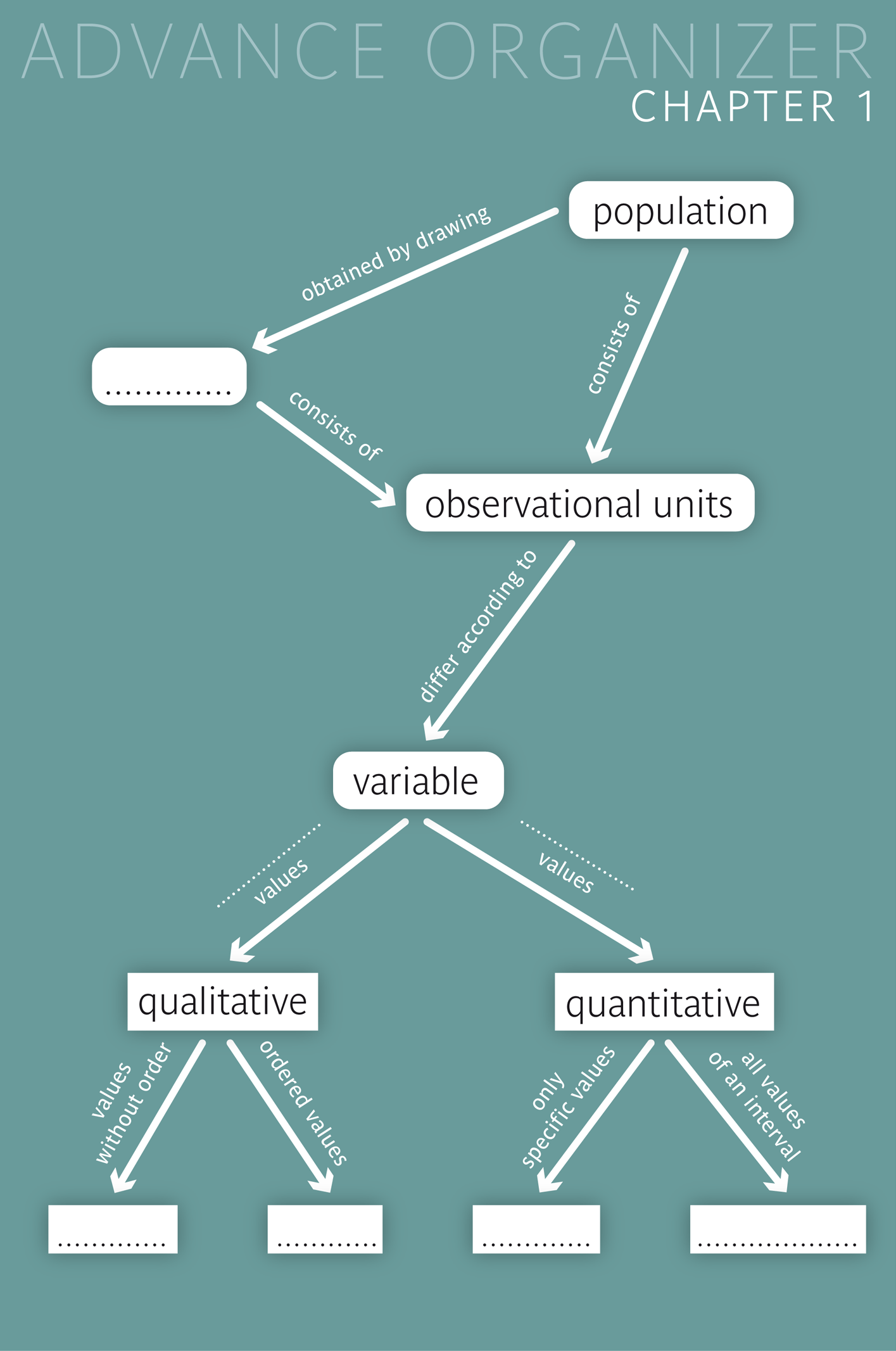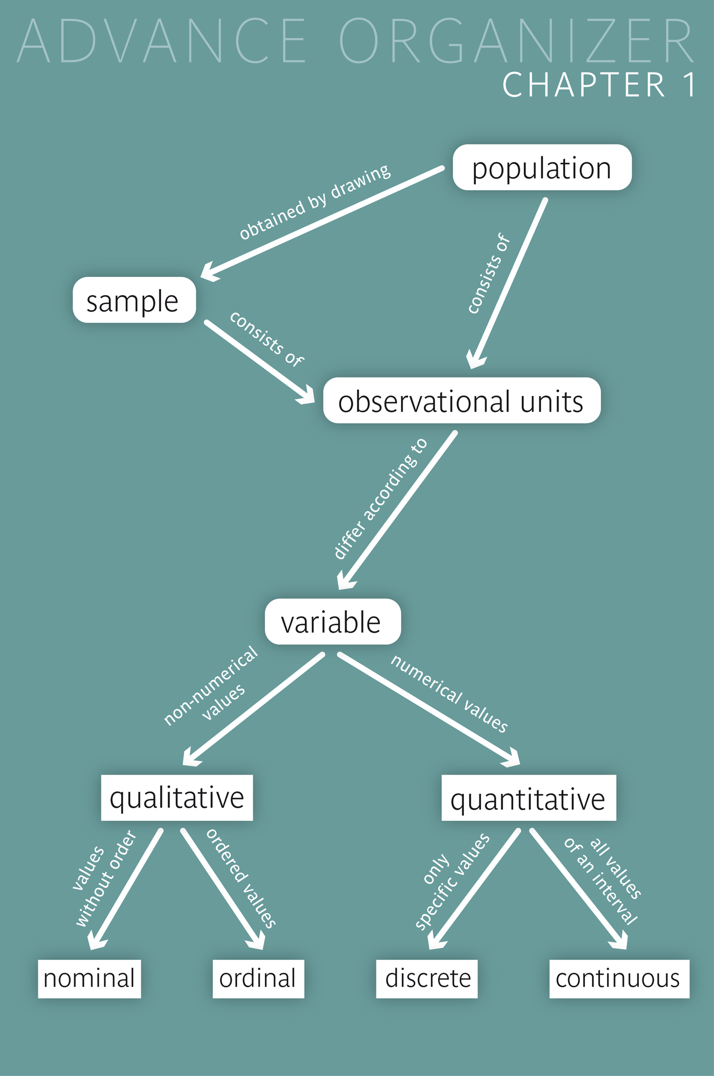 After having worked through this chapter you will know the fundamental terms of statistics. You will be able to describe the population from which a sample was drawn and the observational units and variables involved in a sample. You can classify variables based on their values. Key words: population, sample, observational unit, variable, value, type of variable |