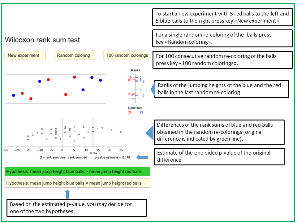 The applet "Rank sum test" illustrates the working of the Wilcoxon rank sum test. After pressing the key "New Experiment", five blue and five red balls drop down from the ceiling and jump back from the floor, each one to a different height. There are two alternative random mechanism producing the jumping heights of the balls. The first one follows the null hypothesis that the average jumping heights of the red and the blue balls are identical, while the other mechanism follows a specific alternative hypothesis that the mean jumping height of the blue balls is higher than the one of the red balls. When starting the experiment, each of the two hypotheses has the same probability of being selected. You are asked to decide whether the null hypothesis or the alternative hypothesis was selected and to press the respective key at the bottom. The ranks of the jumping heights of the blue and red balls are displayed in the stick diagram to the right, the sums of the ranks of the red and the blue balls are indicated underneath the stick diagram, and the difference D between the sum of ranks of the blue and the red balls is displayed in the diagram below the balls as a vertical green line. The black vertical line at 0 represents the mean of D under the mull hypothesis. Thus, a large positive difference speaks in favour of the alternative hypothesis, while a value of D close to 0 rather speaks in favour of the null hypothesis.