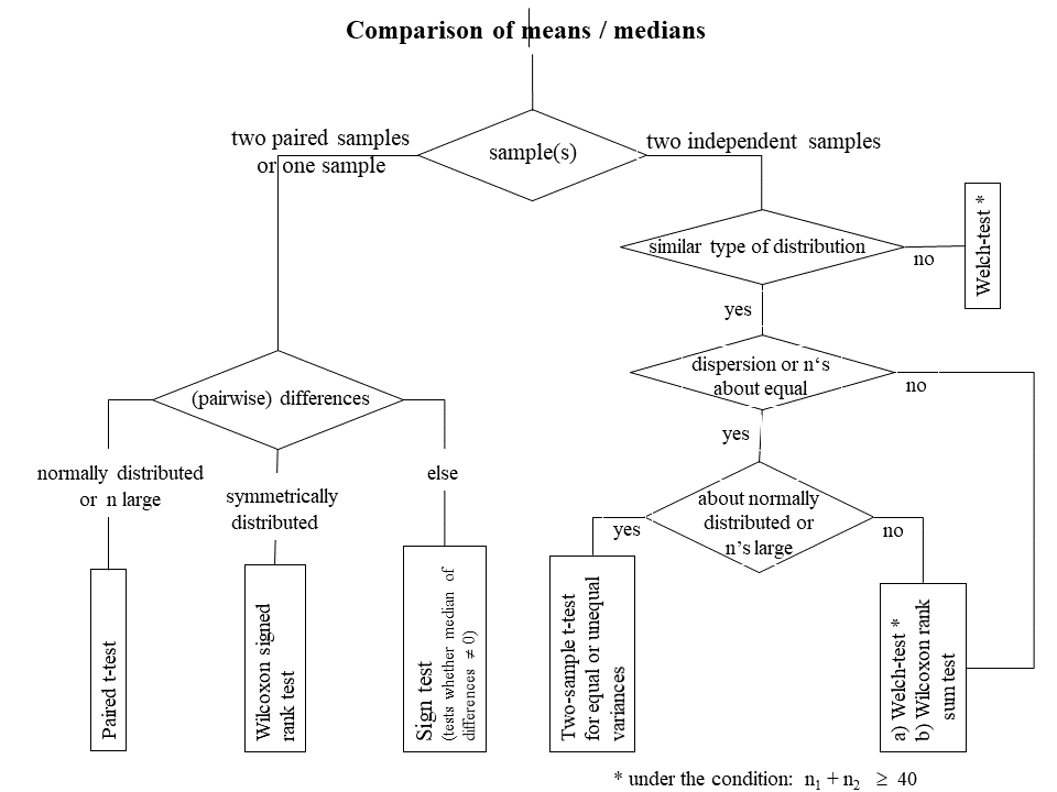 In a second step the testing situations are distinguished based on the number, dependency and size of the samples to be compared. These different situations ask for different test procedure. We differentiate between