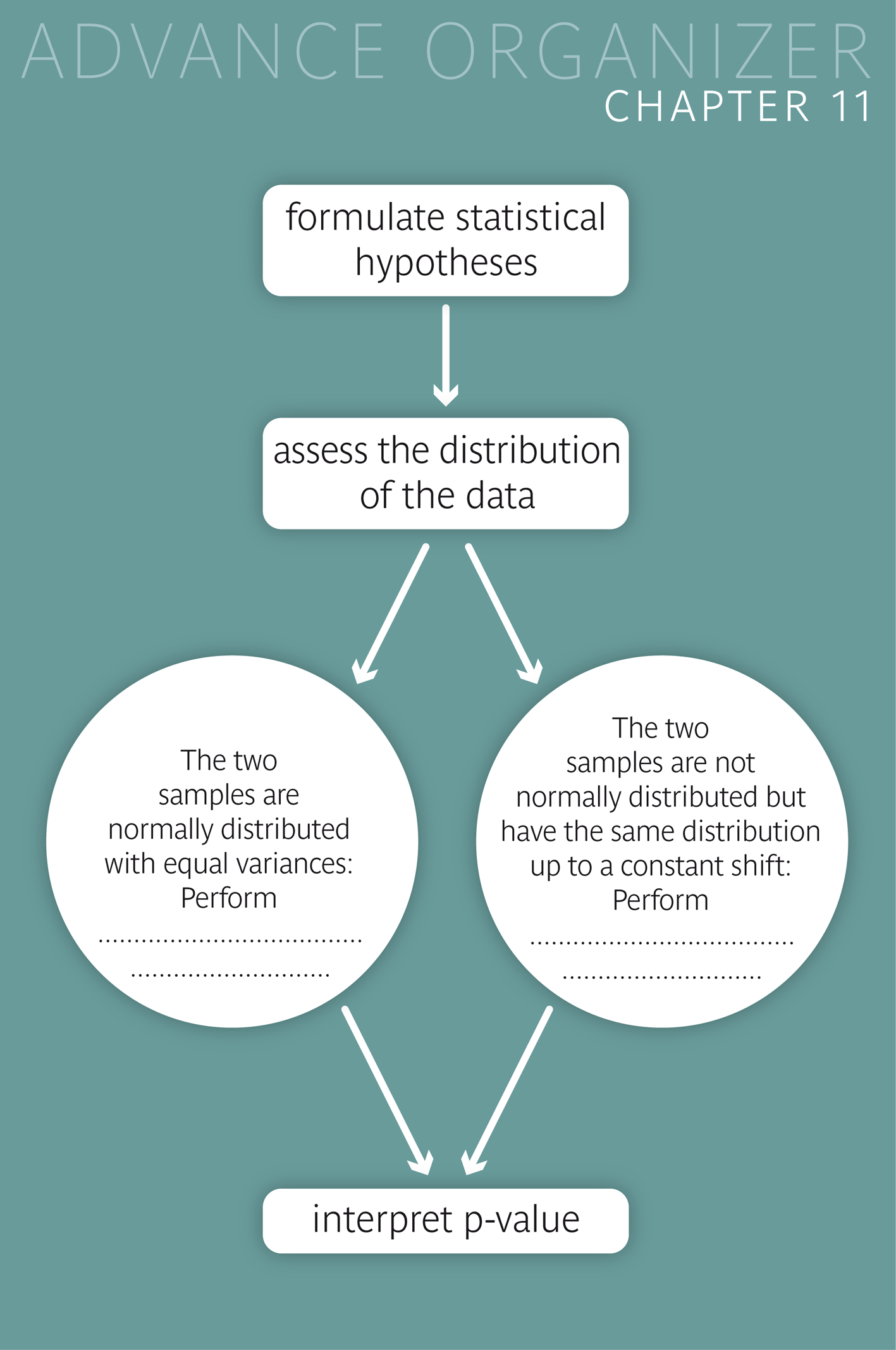 A testing situation can be characterised based on the following criteria: a) the data type b) the number of samples c) the dependency structure of the sample(s) d) the sample size(s). |