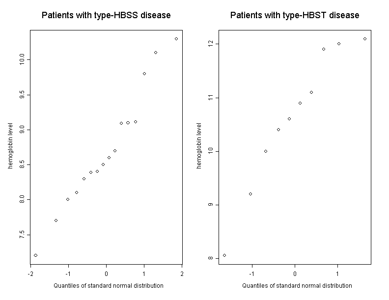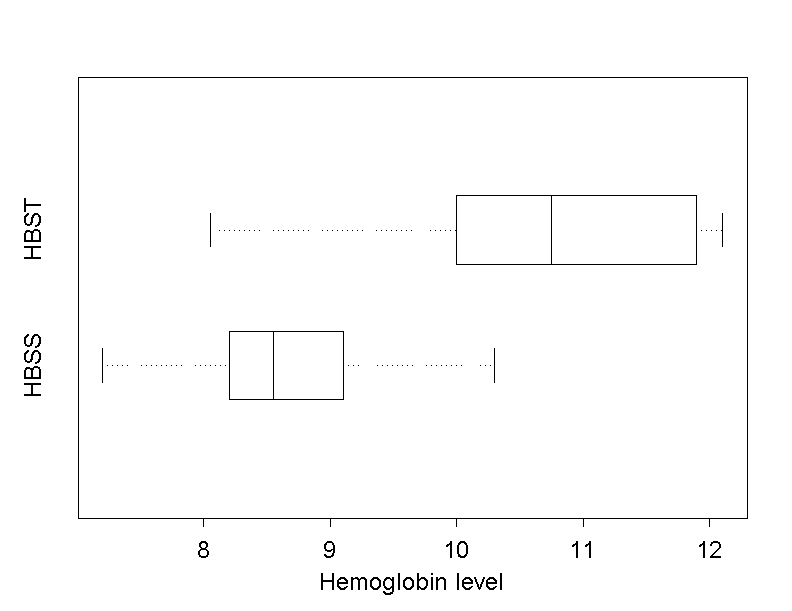 The sample standard deviations are \(0.85\) in the HBSS-group and \(1.29\) in the HBST-group. Since the ratio of the two standard deviations does not deviate too much from 1, we can hypothesize that the population standard deviations are not too different either. Under the condition that the distributions of heamoglobin are identical in both populations up to a shift (i.e., that they are congruent), we can apply the so-called "Wilcoxon rank sum test" to test the null hypothesis \[ H_0 : \mu_{HBSS} = \mu_{HBST} \] against the two-sided alternative hypothesis \[ H_A : \mu_{HBSS} \neq \mu_{HBST} \] where \( \mu_{HBSS} \) denotes the mean haemoglobin concentration in the HBSS-population and \( \mu_{HBST} \) the mean haemoglobin concentration in the HBST-population.