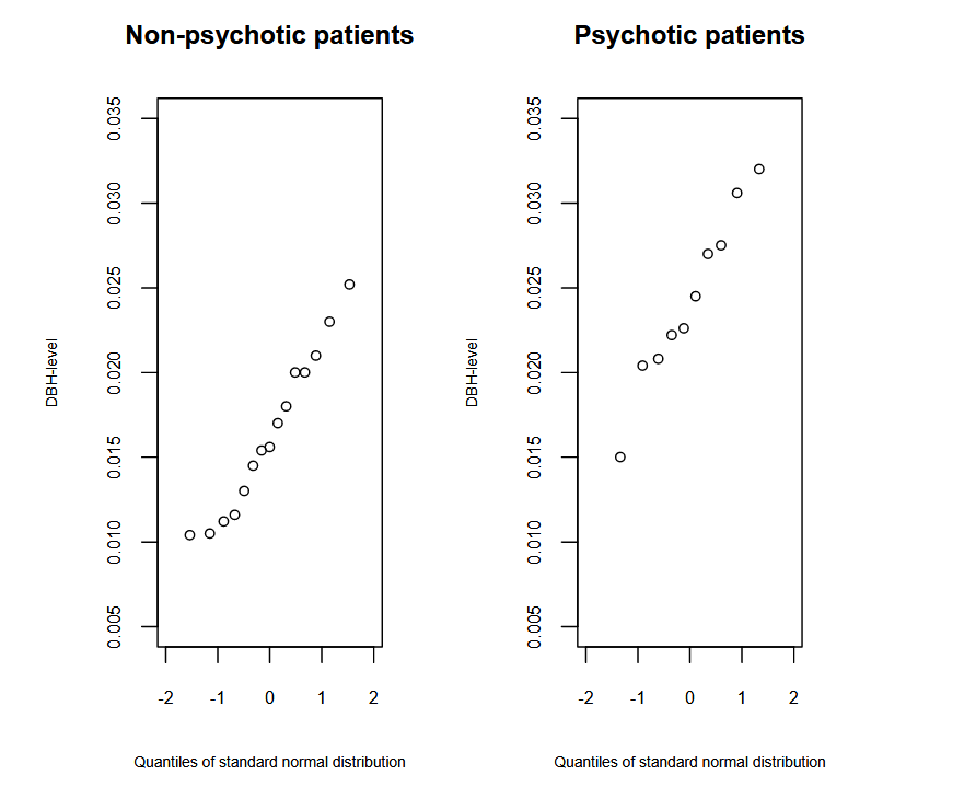 We look at the Q-Q-plot of the data of the schizophrenia example in figure 11.2 and reason that both the measurements of psychotic and non-psychotic patients are approximately normally distributed.