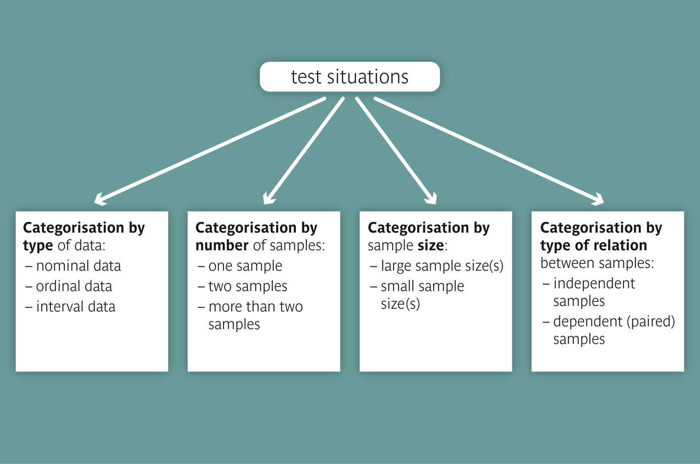In general, a testing situation can be classified according to the criteria "data type", "number of samples", "sample size" and "dependency structure of the samples".