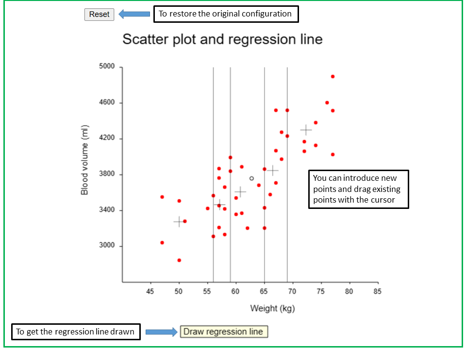 You can also add points by clicking the cursor and drag points with the cursor. The reticles and the regression line will change accordingly. By pressing the reset-button in the upper left corner, the original configuration can be restored.