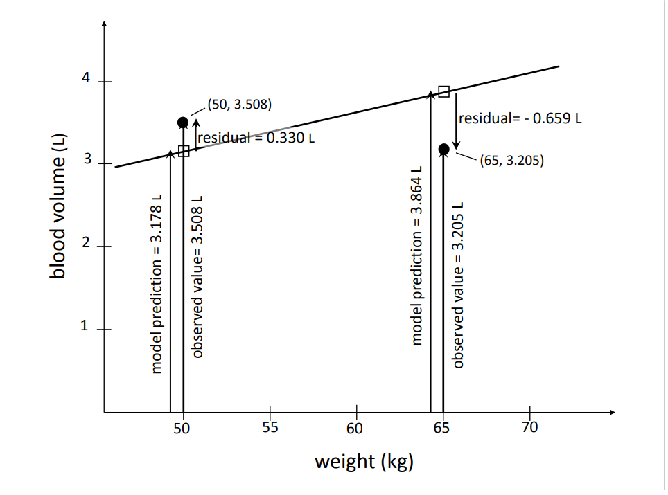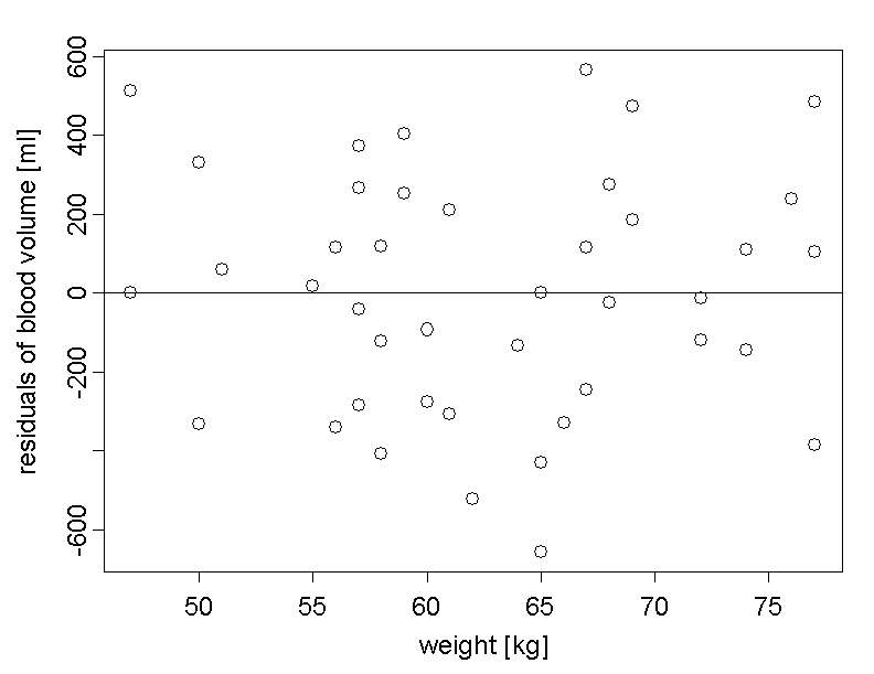 If the relation is not linear in reality, a straight-line model does not make much sense. In order to judge if the mean of the blood volume indeed increases linearly with the body weight, we can again take a look at the residual plot. If the relation were not linear, the scatter plot of the residuals would not be horizontal but rather curved or undulated.