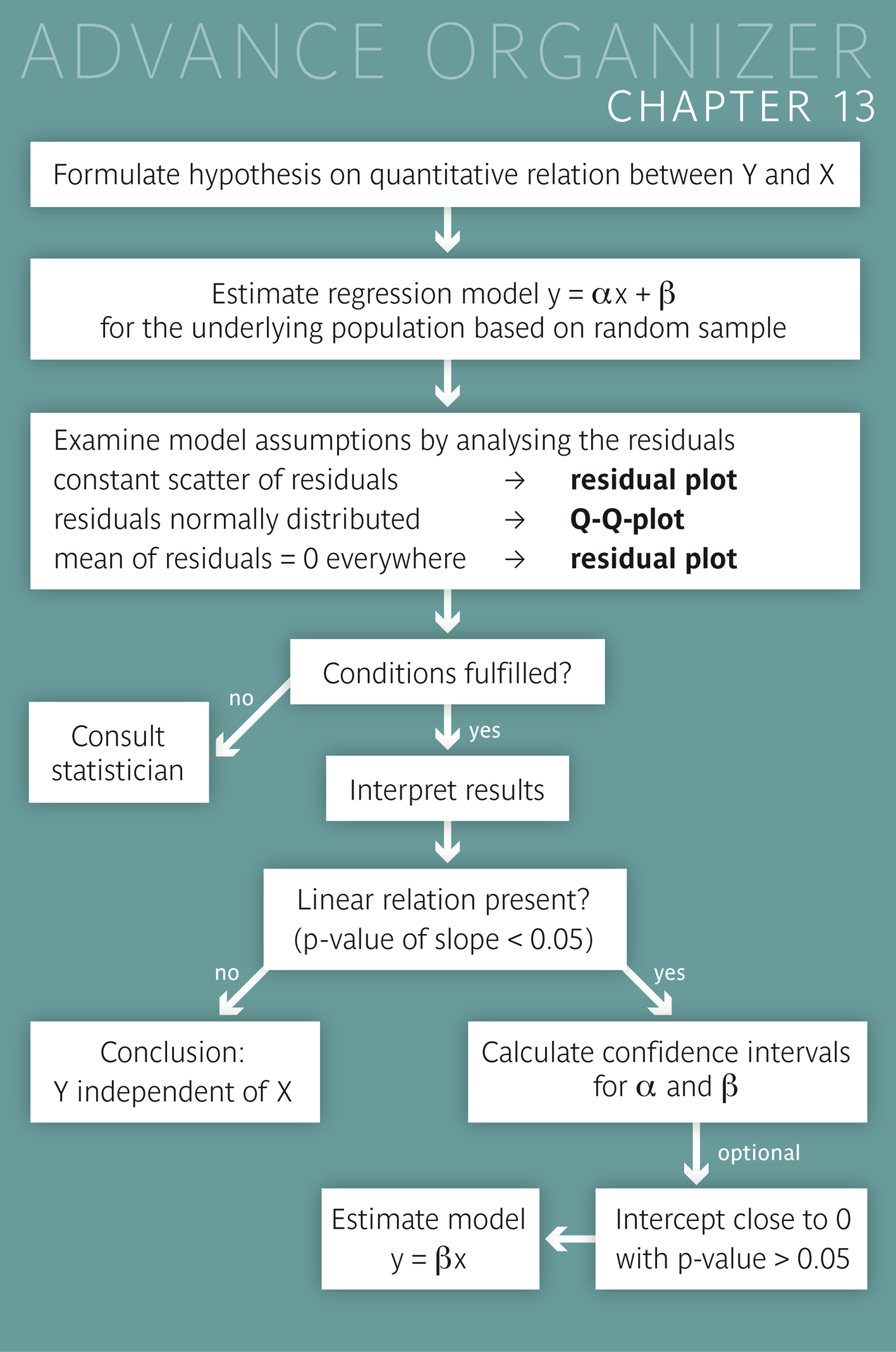 Educational objectives You can explain in your own words what a regression line tells about the relation between a dependent variable \(Y\) and an independent variable \(X\) and what the residuals mean. You are familiar with important properties of the regression line and you can explain how regression lines are defined. lines from other lines. You can correctly interpret the parameters of the regression line (slope and intercept) in concrete examples. You are able to judge if a straight-line model is suitable for the description of a quantitative relation. You are familiar with the conditions which must be fulfilled in order for the standard errors of the regression parameters to be estimated correctly. You can extract and interpret the most important information from a regression output provided by a statistics program. In particular you will be able to judge the statistical significance of a parameter estimate and interpret it correctly. You will also be able to calculate confidence intervals for the regression parameters based on the information in the regression output. Key words: regression line, regression parameter, intercept, slope, residuals, regression equation, regression model, model assumptions, residual plo Previous knowledge: scatter plot (chap. 2), sample mean (chap. 3), population parameters (chap. 4), normal distribution, Q-Q plot (chap. 6), standard error, confidence interval (chap. 8), statistical hypothesis, statistical test, \(p\)-value (chap. 9) Central questions: When does it make sense to describe the relation between a variable \(Y\) and a variable \(X\) by a regression line model? How does such a model have to be interpreted and under which conditions is it valid? |