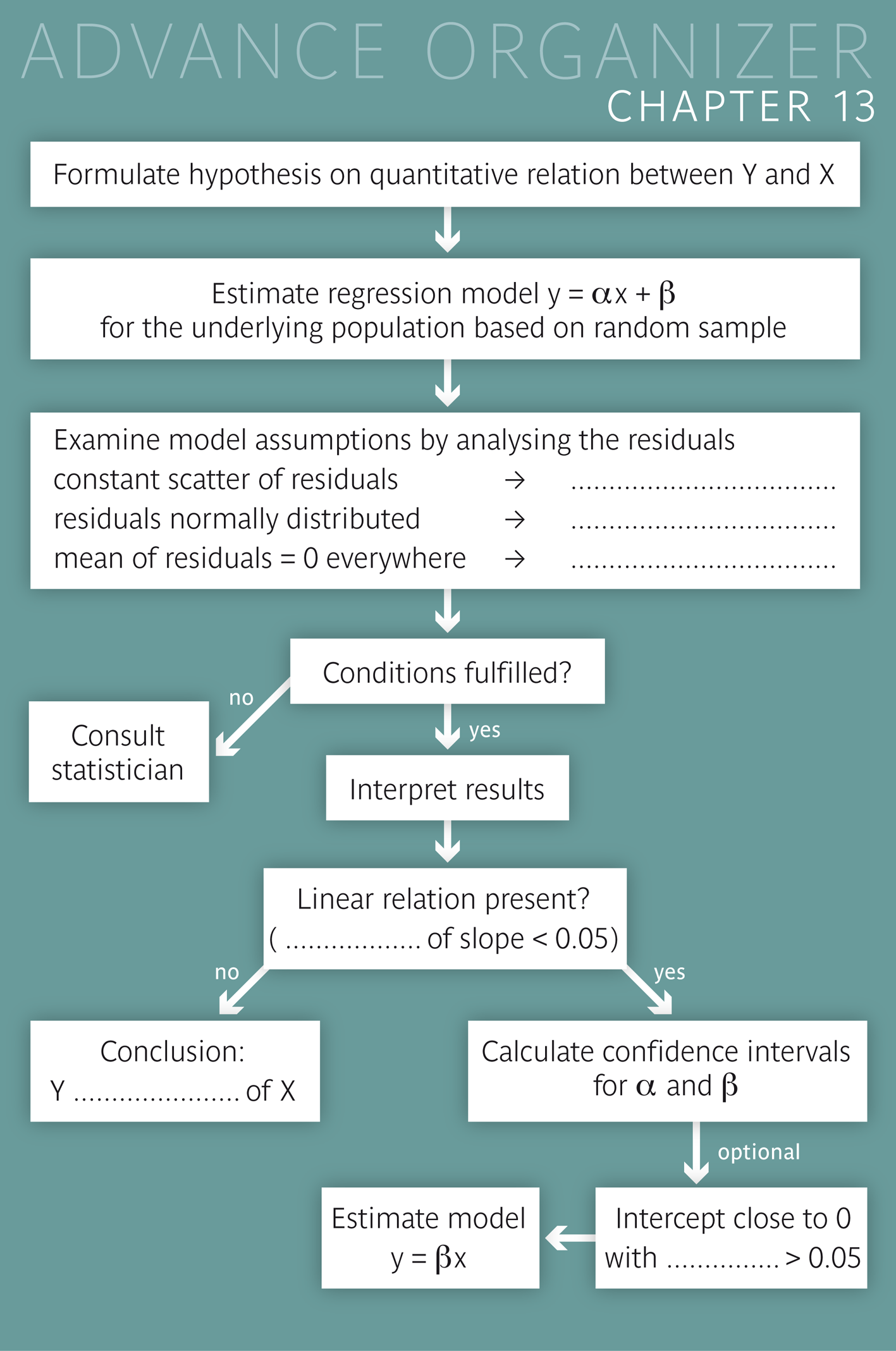 The regression equation along with the model assumptions constitute the so-called "regression model". The classical regression model thus requires that the residuals be normally distributed, have a mean value of \(0\) and a constant scatter within the range of \(X\), and be independent of one another.