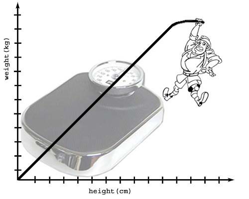 The plot is divided into 5 sectors with about the same number of points. In each of the sectors, the centre of gravity (i.e., defined by the mean values of weight and blood volume) is drawn as a grey reticle. You can see that these reticles are lined up pretty much along a straight line.