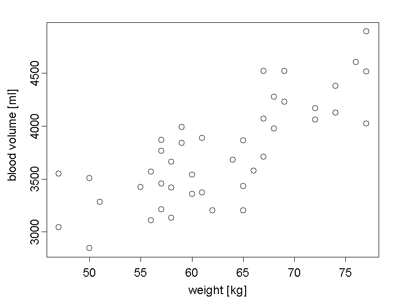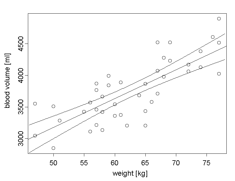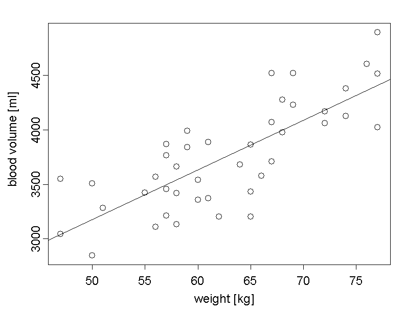 We can see that the reticles lie roughly on a straight line. Therefore we can assume a linear relation between the mean blood volume of adult women and their body weight. We are thus looking for a straight line which best possibly describes this relation. Depending on the definition of "best possible", we get different mathematical solutions. However, we will only treat the classical definition, which has the best mathematical properties in many situations and which provides the classical regression line.