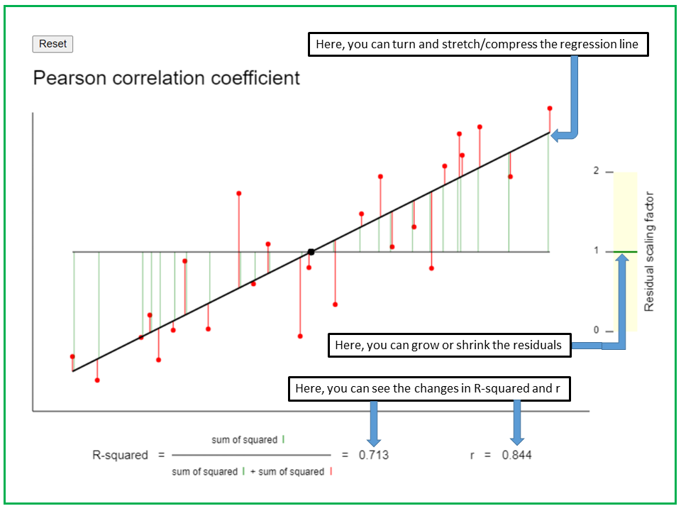 In the applet "Pearson correlation coefficient", you can explore the properties of the Pearson correlation coefficient. By seizing one of the ends of the black regression line, you can rotate the line or stretch or crush it in horizontal or vertical direction. When doing this, the residuals remain unchanged, i.e., the points keep their original vertical distance from the regression line. With the black ruler on the right hand side, one can grow or shrink the residuals. The effects of these interventions on the Pearson correlation coefficient r and its square, R-squared, can be observed at the bottom. To illustrate the definition of R-squared, the residuals are represented as red arrows ranging from the regression line to the respective point, and the predicted values on the regression line as green arrows ranging from the mean level to the regression line.