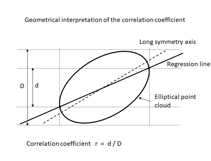 We notice that the regression line differs from the long symmetry axis of the ellipse. The regression line cuts the boundary of the ellipse at the points with the most extreme \(x\)-coordinates. On the inside of the ellipse, the \(y\)-values of the regression line vary within an interval of length \(d\). The \(y\)-coordinates of the points of the ellipse however spread across a larger interval of length \(D\). In fact, the ratio between \(d\) and \(D\) equals the correlation coefficient \(r\).