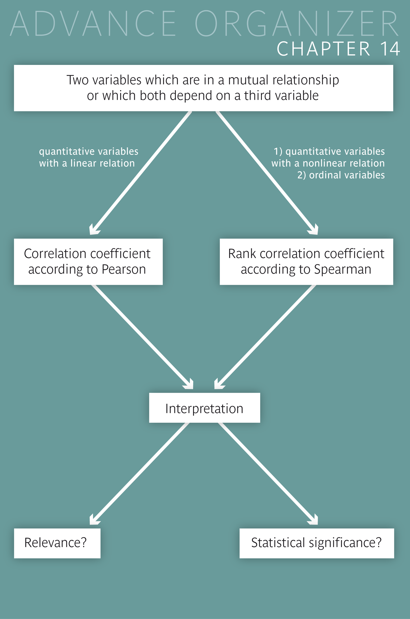 You are familiar with Pearson's correlation coefficient and you can explain what it expresses. You can explain the idea of the coefficient of determination of a simple linear regression model and can calculate it from the correlation coefficient. You are familiar with the most important properties of Pearson's correlation coefficient. You can explain what it means if the correlation coefficient has a value of \(1\) or \(-1\) and you know different situations in which the correlation coefficient is \(0\). You are also familiar with situations in which a high correlation coefficient does not reflect a linear relation between the two variables. You know how and under which conditions the hypothesis of a linear correlation between two quantiative variables can be tested. You are furthermore familiar with Spearman's rank correlation coefficient, which can measure linear and non-linear relations between numerically and ordinally scaled variables. You can explain what the extreme values \(1\) or \(-1\) mean with the rank correlation coefficient. You can decide in which cases the rank correlation coefficient should be preferred to the classical correlation coefficient. Key words: linear relation, variance explained, coefficient of determination, Pearson's correlation coefficient, Spearman's rank correlation coefficient Previous knowledge: scatter plot (chap. 2), mean value, standard deviation, variance (chap. 3), normal distribution, Q-Q plot (chap. 6), hypotheses, \(p\)-value (chap. 9), regression line, slope parameter (chap. 13) Central questions: How can the correlation between two quantitative variables be measured if neither of them takes the role of the dependent or independent variable? |
