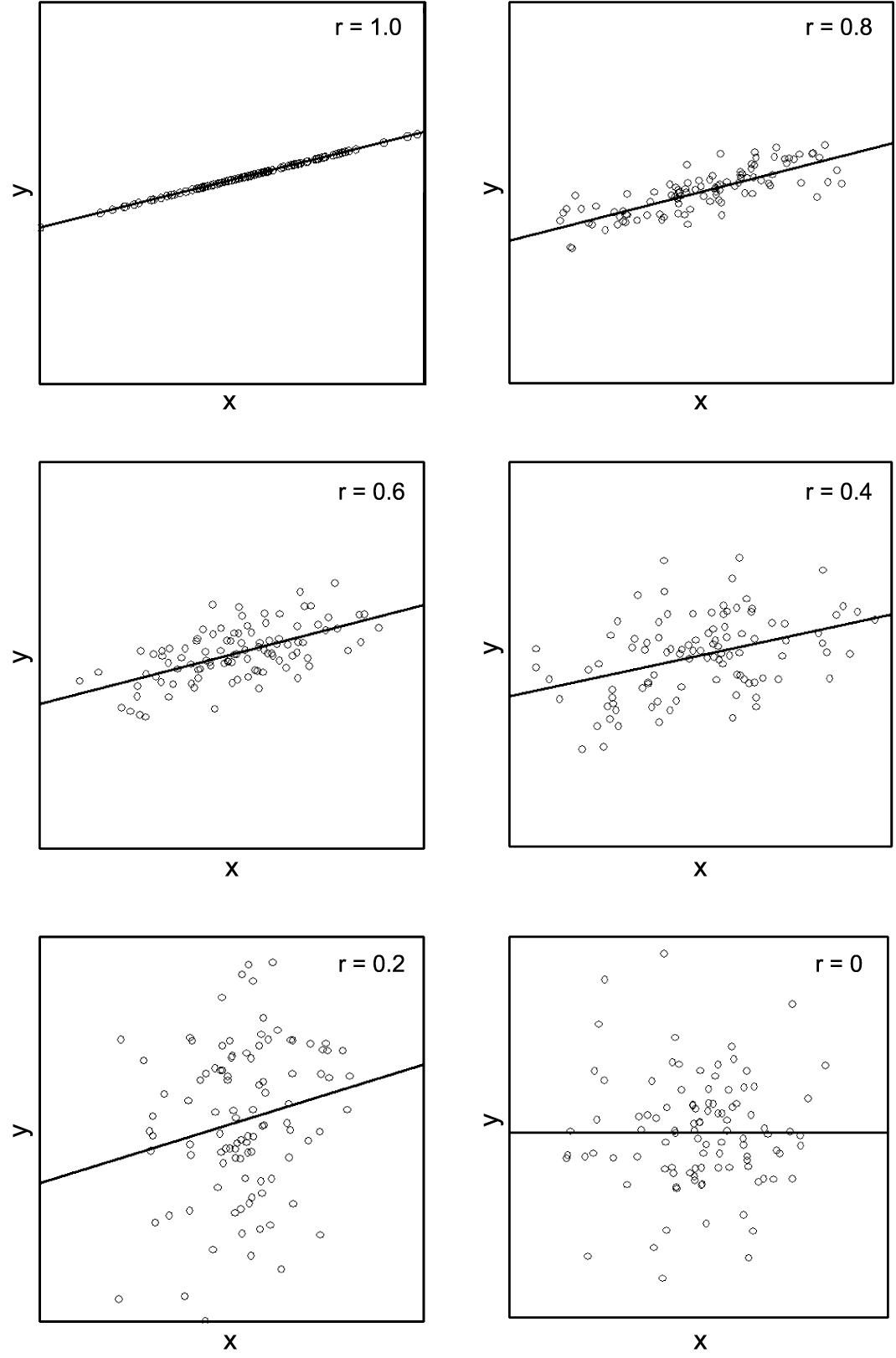 The illustrated correlations range between \(r = 1\) in the upper left plot and \(r = 0\) in the lower right plot. With the exception of the last scatter plot, all others have regression lines with a positive slope. Furthermore we notice that, in all diagrams, the points are about equally distributed in \(y\)-direction on both sides of the regression line.