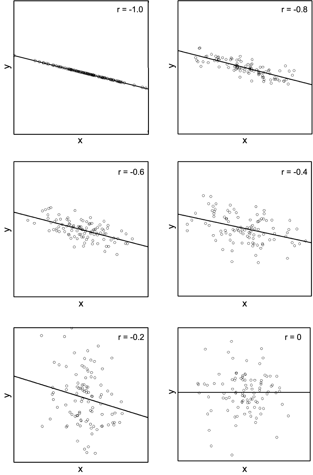 Under certain conditions, the correlation coefficient is thus a measure of how much information the two variables \(X\) and \(Y\) contain about each other. If \(r = 1\) and the two variables define a straight line, then each one of them contains the complete information (\(100\%\)) about the other one. In the other extreme case, the two variables contain no information (\(0\%\)) at all about each other. The restriction "under certain conditions" is justified. We will soon encounter an example in which \(Y\) is completely determined by \(X\) and yet \(r = 0\) holds. But before, we take a look at analogue scatter plots with negative linear relations between \(X\) and \(Y\) of different strength.