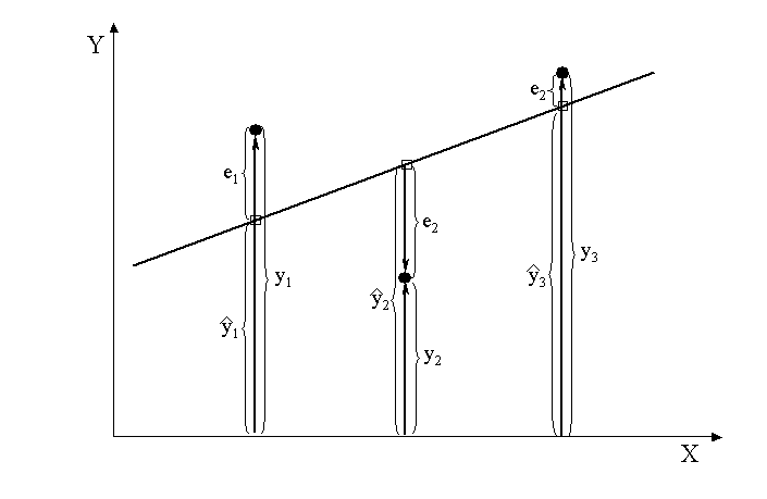 In a scatter plot with a regression line \(y = \hat{\alpha}_{Y|X} + \hat{\beta}_{Y|X} \times x\), we can, for each data point \((x_i, y_i)\), determine the corresponding point \( (x_i,\hat{\alpha}_{Y|X} + \hat{\beta}_{Y|X} \times x_i) \) on the regression line (i.e., the point with the same \(x\)-coordinate). The \(y\)-coordinate \(\hat{\alpha}_{Y|X} + \hat{\beta}_{Y|X} \times x_i\) of this point is usually denoted by \(\hat{y}_i\). In the following schematic figure a scatter plot with three points and the corresponding regression line is shown. The observed values \(y_i\), the respective predicted values \(\hat{y}_i\), as well as the residuals \(e_i = y_i - \hat{y}_i\) are labeled.