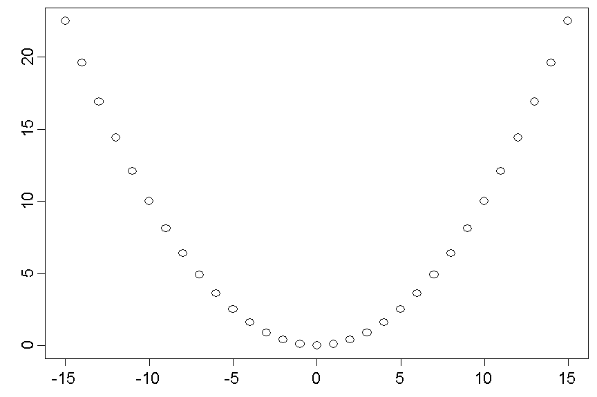 A correlation coefficient of \(0\) does not imply that there is no relation between the two variables \(X\) and \(Y\), it only implies that there is no linear relation between them. |