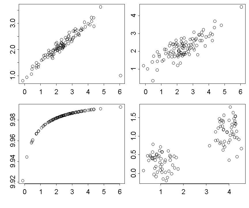 In all other cases, the respective scatter plot should be examined in order to interpret the correlation coefficient. The four scatter plots in the following figure illustrate that we need to pay attention when interpreting a correlation coefficient