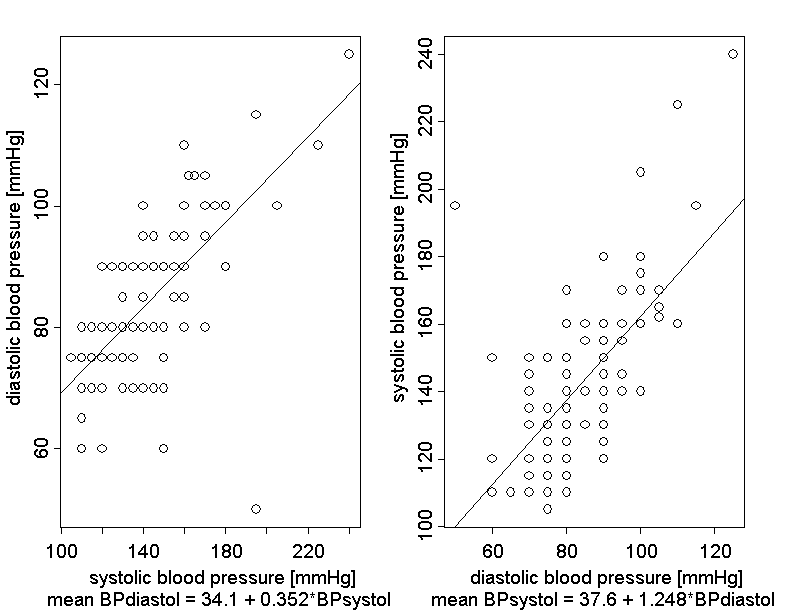 We can thus also say that systolic blood pressure of our example explains a proportion of \(0.6632^2 = 0.439\) or \(43.9\%\) of the variance of diastolic blood pressure. Conversely, the same percentage of the variance of systolic blood pressure is explained by diastolic blood pressure.