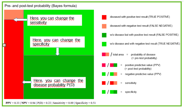 This approach can be visualized with the applet "Pre- and post-test probability" which provides a graphical representation of the Bayes-formula.