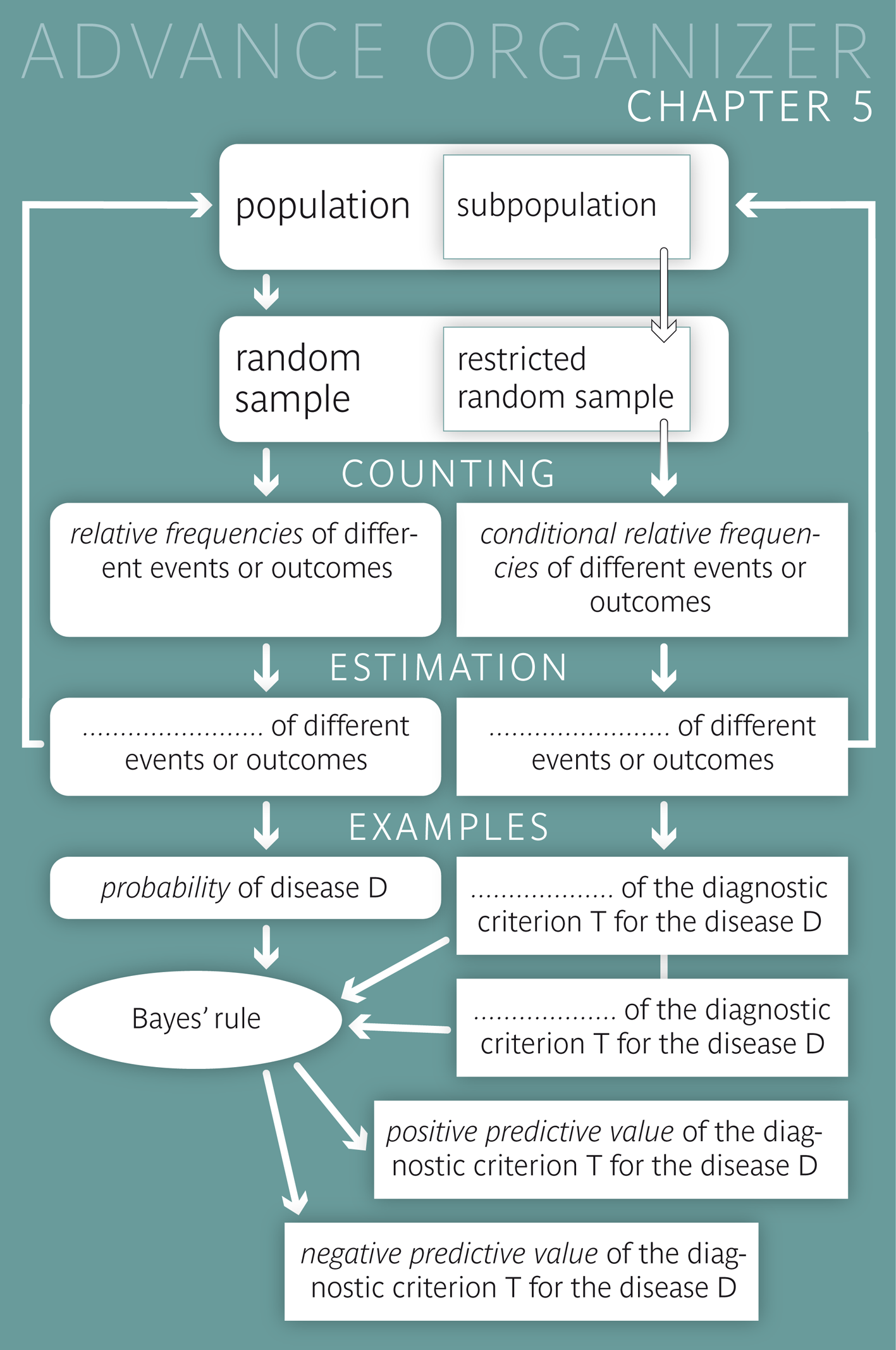 Probabilities always relate to events \(E\) of which we do not know if they will occur or not (e.g. the occurrence of a specific disease \(D\), a positive result of a diagnostic test, etc.).