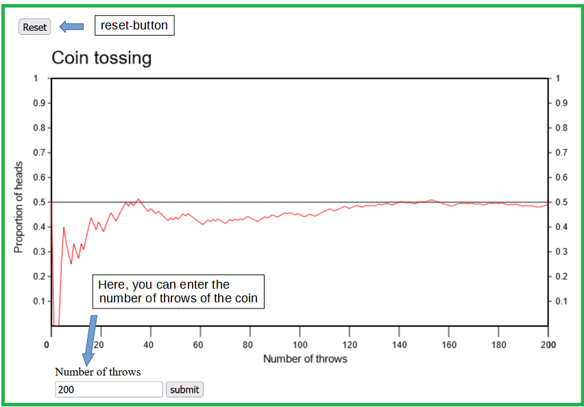 If a coin is tossed repeatedly, it shows heads or tails in a random succession. With a so-called fair coin we can expect heads and tails with equal probability at each toss. The repeated tossing of a fair coin can be simulated with the applet "Coin tossing". It illustrates the random fluctuations of the proportion of heads. These fluctuations are getting smaller and smaller as the number of coin tosses increases, up to the point at which the relative frequency levels off at a value of \(0.5\).