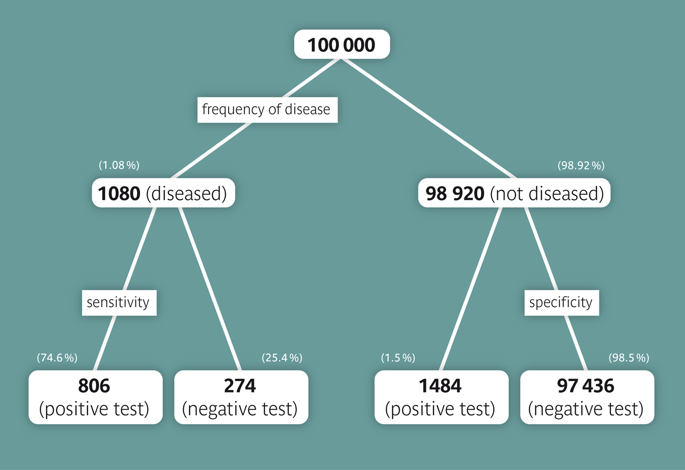 We can assume that women, whose mothers died of breast cancer, have about a fourfold risk of getting breast cancer themselves. We therefore assume that the risk to get breast cancer within one year is \( 1.08% = (4 \times 0.27%) \) for such women. We now want to calculate the positive predictive value of a positive mammography result among women, whose mothers died of breast cancer. To do so, we assume that the values of sensitivity (\(74.6 \%\)) and specificity (\(98.5 \%\)) calculated before are still valid and represent the true values in the underlying population. To simplify the task, we proceed from a collective of 100,000 women: On average, we could thus expect \( 100,000 \times 0.0108 = 1080 \) women with a diagnosis of breast cancer of which \( 1080 \times 0.746 = 806 \) would have a positive mammography result. On the other hand, of the 98920 women without breast cancer, \( 98920 \times (1 - 0.985) = 1484 \) would have a positive test result as well. On average, we could thus expect 1484 + 806 = 2290 cases with a positive mammography result, of which 806 would be confirmed with a breast cancer diagnosis. The positive predictive value would therefore be \(806/2290 = 0.352\) or \(35.2 \%\). This is not quite four times the positive predictive value among women in general, since the denominator of the ratio also increased.